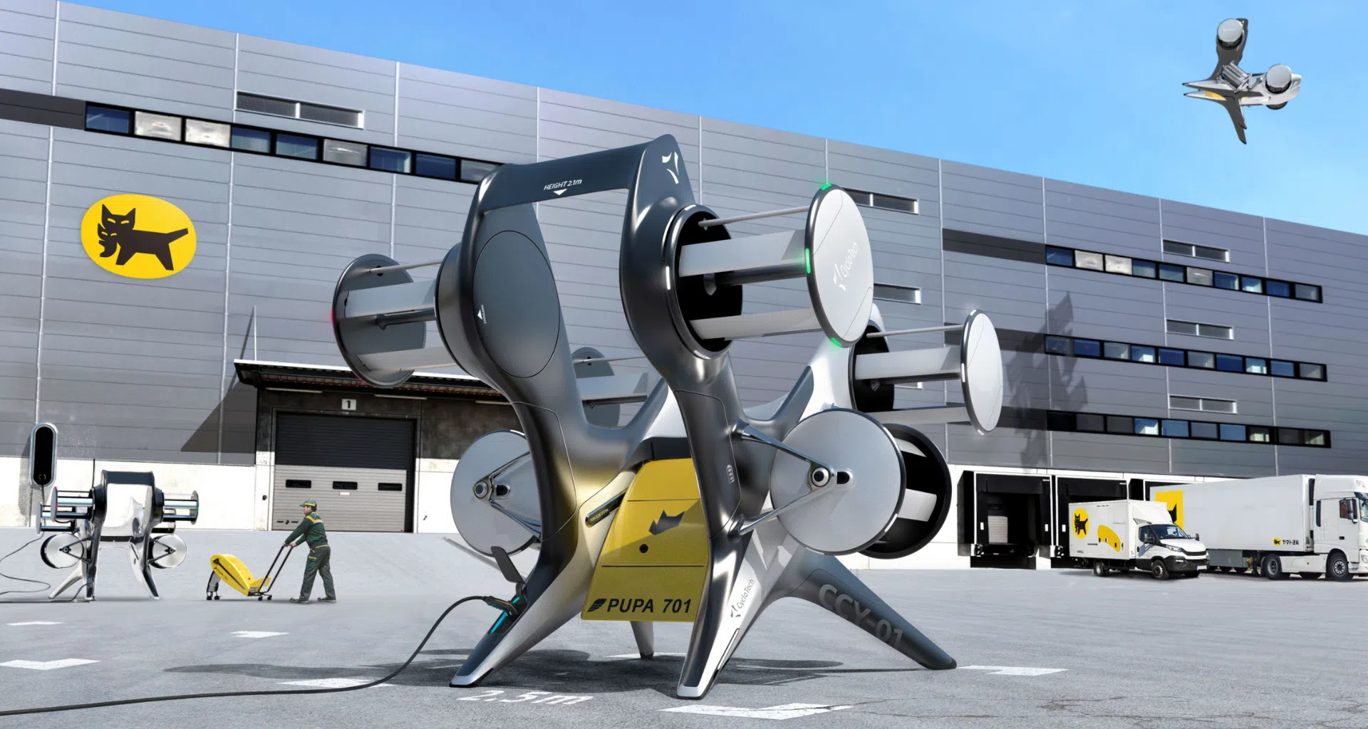 A ヤマトホールディングス 製品が輸送される拠点の開発を担当しました。 新しい配達用ドローンのこのユニークなアクセサリーに付けられた名前は POD ですが、実際には空を飛ぶショッピング カートをイメージして使用されます。